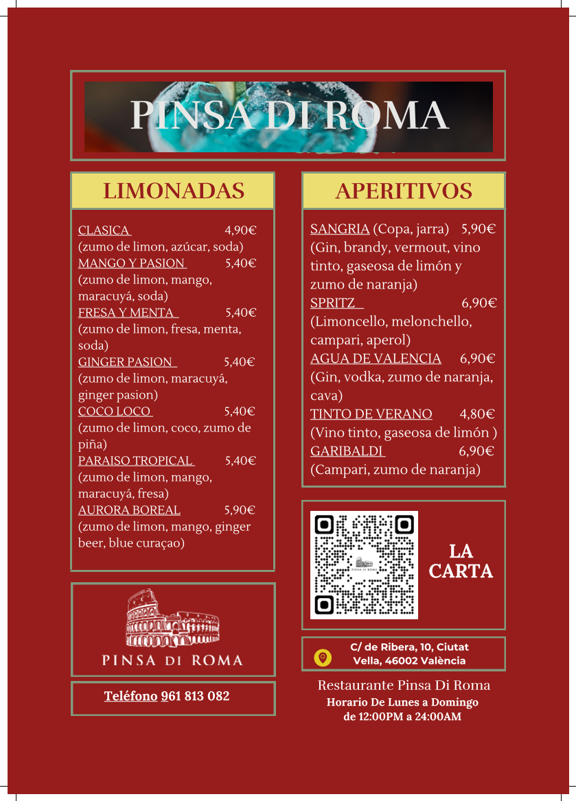 Welcome to Pinsa di Roma - Av. Cortes Valencianas, a charming Italian eatery nestled in Benicalap, Valencia. The menu is a delightful reflection of authentic Italian cuisine, featuring their signature pinsas—light, crispy flatbreads topped with fresh ingredients. Highlights include the VEGETARIANA with zucchini and cherry tomatoes (€10.90) and the luxurious SALMONE E BRIE (€11.90), combining mozzarella, brie, and smoked salmon.